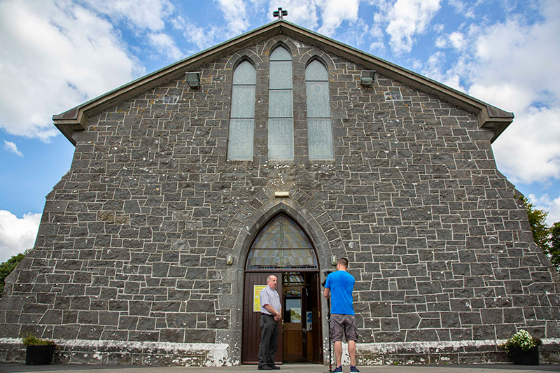 The first chapel was built in Belcarra in the late 1700s as the Penal Laws were being relaxed. It was a modest cruciform thatched building built near the bridge on the banks of the river where the Sports Centre now stands. It came right out the edge of the road and the present Marian Grotto would have been inside the East transcript.